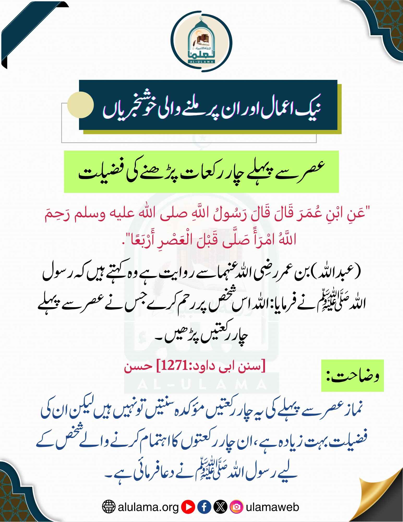 Post published: اپریل 16, 2026 Post category: آداب واخلاق - اعمال، وظائف، اذکار وادعیہ - سنتیں نوافل نماز وتر تہجد و تراویح ناشر: العلماء عصر سے پہلے چار رکعات پڑھنے کی فضیلت Post Views: 9 اس موضوع کے دیگر گرافکس مزید دیکھیں 144 بار دیکھا گیا اعمال، وظائف، اذکار وادعیہ قیامت کے دن درہم و دینار کی بجائے نیکیاں خرچ ہوں گی ستمبر 20, 2025 208 بار دیکھا گیا اعمال، وظائف، اذکار وادعیہ بے انتہا فضیلت والے کلمات دسمبر 23, 2024 293 بار دیکھا گیا اعمال، وظائف، اذکار وادعیہ چار چیزوں سے پناہ مانگنا ضروری ہے جنوری 28, 2025 اس ناشر کے دیگر گرافکس مزید دیکھیں 181 بار دیکھا گیا اعمال، وظائف، اذکار وادعیہ یقینا کامیات ہوگئے مومن اگست 6, 2025 102 بار دیکھا گیا اقوال سلف صالحین غیر مسلموں کو راز دان نہ بنائیں ستمبر 9, 2024 202 بار دیکھا گیا اعمال، وظائف، اذکار وادعیہ اللہ تعالی کن لوگوں کے ساتھ ہے نومبر 9, 2024