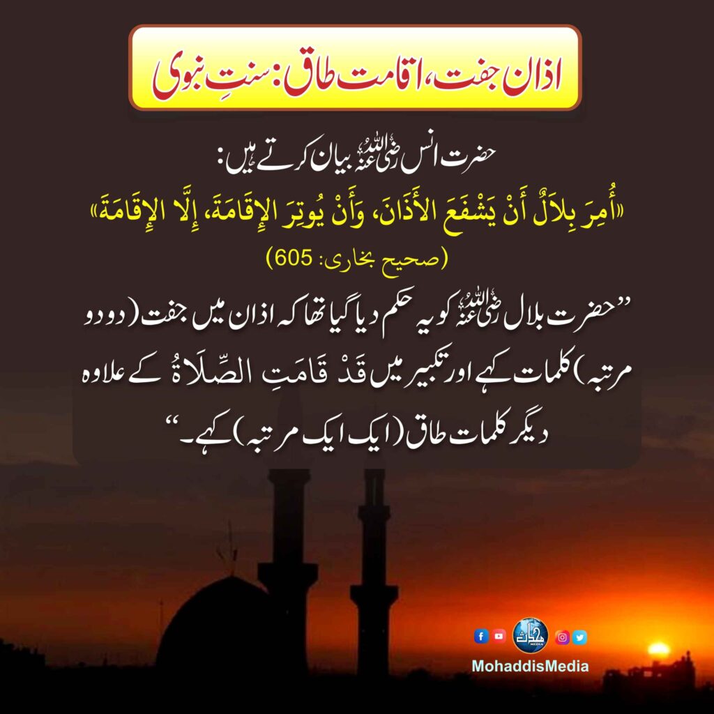 Post published: فروری 25, 2026 Post category: اذان واقامت ناشر: مرکز النور (محدث میڈیا) اذان جفت اقامت طاق سنت نبوی Post Views: 143 اس موضوع کے دیگر گرافکس مزید دیکھیں 310 بار دیکھا گیا اذان واقامت اذان کے دوران رسول اللہ ﷺ کا نام آنے پر درود بھیجنا مئی 8, 2025 175 بار دیکھا گیا احکام ومسائل نماز امامت کا حقدار کون ستمبر 27, 2024 520 بار دیکھا گیا آداب واخلاق اذان کے اذکار مئی 23, 2024 اس ناشر کے دیگر گرافکس مزید دیکھیں 254 بار دیکھا گیا فقہ وفتاویٰ محرم میں شادی اور کسی بھی طرح کی خوشی کرنے کا حکم اپریل 15, 2025 281 بار دیکھا گیا آداب واخلاق رسول اللہ ﷺ بدلہ کب لیتے؟ نومبر 18, 2025 155 بار دیکھا گیا ارشاد باری تعالٰی معبود رحق کون؟ اکتوبر 10, 2025
