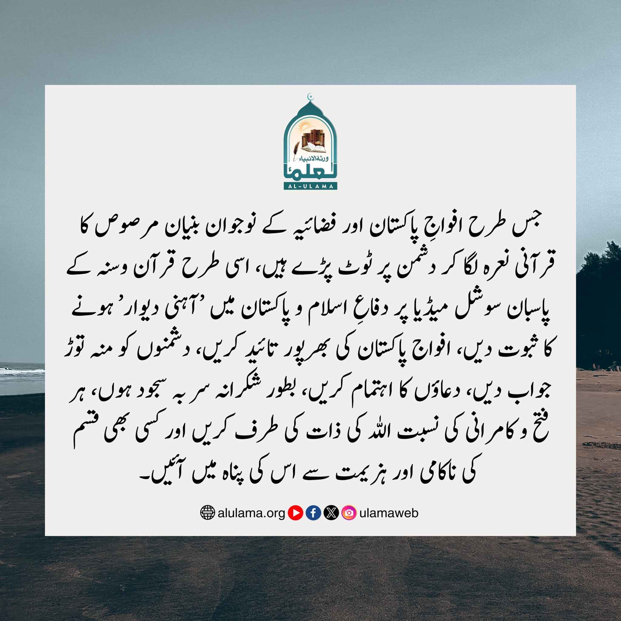 Post published: اپریل 1, 2026 Post category: جہاد ،شہادت وشہداء ناشر: العلماء بنیان مرصوص Post Views: 27 اس موضوع کے دیگر گرافکس مزید دیکھیں 277 بار دیکھا گیا ارشاد باری تعالٰی تم ہی غالب ہو اگر تم مومن ہو نومبر 1, 2025 170 بار دیکھا گیا 01. محرم الحرام اٹھارہ ذوالحجہ یوم شہادت عثمان رضی اللہ عنہ ستمبر 26, 2024 83 بار دیکھا گیا 01. محرم الحرام عثمان افطاری ہمارے ساتھ کرنا جنوری 3, 2024 اس ناشر کے دیگر گرافکس مزید دیکھیں 190 بار دیکھا گیا اصلاح معاشرہ تمام بھلائیوں والی دعا ستمبر 26, 2024 185 بار دیکھا گیا اقوال سلف صالحین مسکرائیے دسمبر 13, 2024 127 بار دیکھا گیا آداب واخلاق مسلمان بھائی سے قطع کلامی درست نہیں جولائی 17, 2024
