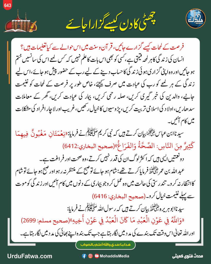Post published: مئی 15, 2025 Post category: فقہ وفتاویٰ ناشر: مرکز النور (محدث میڈیا) چھٹی کا دن کیسے گزارا جائے Post Views: 185 اس موضوع کے دیگر گرافکس مزید دیکھیں 86 بار دیکھا گیا فقہ وفتاویٰ مدینہ منورہ جانے والے سے عرض کرنا کہ نبی ﷺ کو میرا سلام کہنا جولائی 4, 2025 96 بار دیکھا گیا ٹیکس وسود ہاؤس فنانسنگ کے لیے بینک سے قرضہ لینا جولائی 29, 2024 104 بار دیکھا گیا عمرہ، حج وقربانی حجر اسود کو چومنے کی حکمت مارچ 4, 2025 اس ناشر کے دیگر گرافکس مزید دیکھیں 133 بار دیکھا گیا فقہ وفتاویٰ بینک میں ملازمت کرنا اپریل 9, 2025 34 بار دیکھا گیا آداب واخلاق عورتوں پر تشدد کی مذمت جنوری 31, 2024 55 بار دیکھا گیا آداب واخلاق مخلوقات پر رحم دسمبر 27, 2023