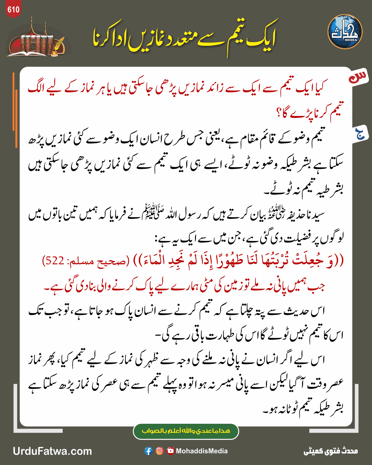 Post published: مئی 15, 2025 Post category: احکام ومسائل نماز - طہارت وپاکیزگی - فقہ وفتاویٰ ناشر: مرکز النور (محدث میڈیا) ایک تیمم سے متعدد نمازیں ادا کرنا Post Views: 240 اس موضوع کے دیگر گرافکس مزید دیکھیں 627 بار دیکھا گیا آداب واخلاق رکوع کی مسنون دعائیں مئی 22, 2024 195 بار دیکھا گیا زکوۃ، صدقات وعشر بارش اور چشموں سے پرورش پانے والی فصل کا عشر مئی 1, 2025 178 بار دیکھا گیا فقہ وفتاویٰ قسم اٹھانے سے متعلق اسلامی احکام مئی 15, 2025 اس ناشر کے دیگر گرافکس مزید دیکھیں 138 بار دیکھا گیا آداب واخلاق زبان کو قابو میں رکھیئے دسمبر 21, 2023 246 بار دیکھا گیا اعمال، وظائف، اذکار وادعیہ اللہ تعالی کے پسندیدہ کلمات اکتوبر 4, 2025 504 بار دیکھا گیا آداب واخلاق اہل ایمان اللہ سے ڈریں اپریل 24, 2024