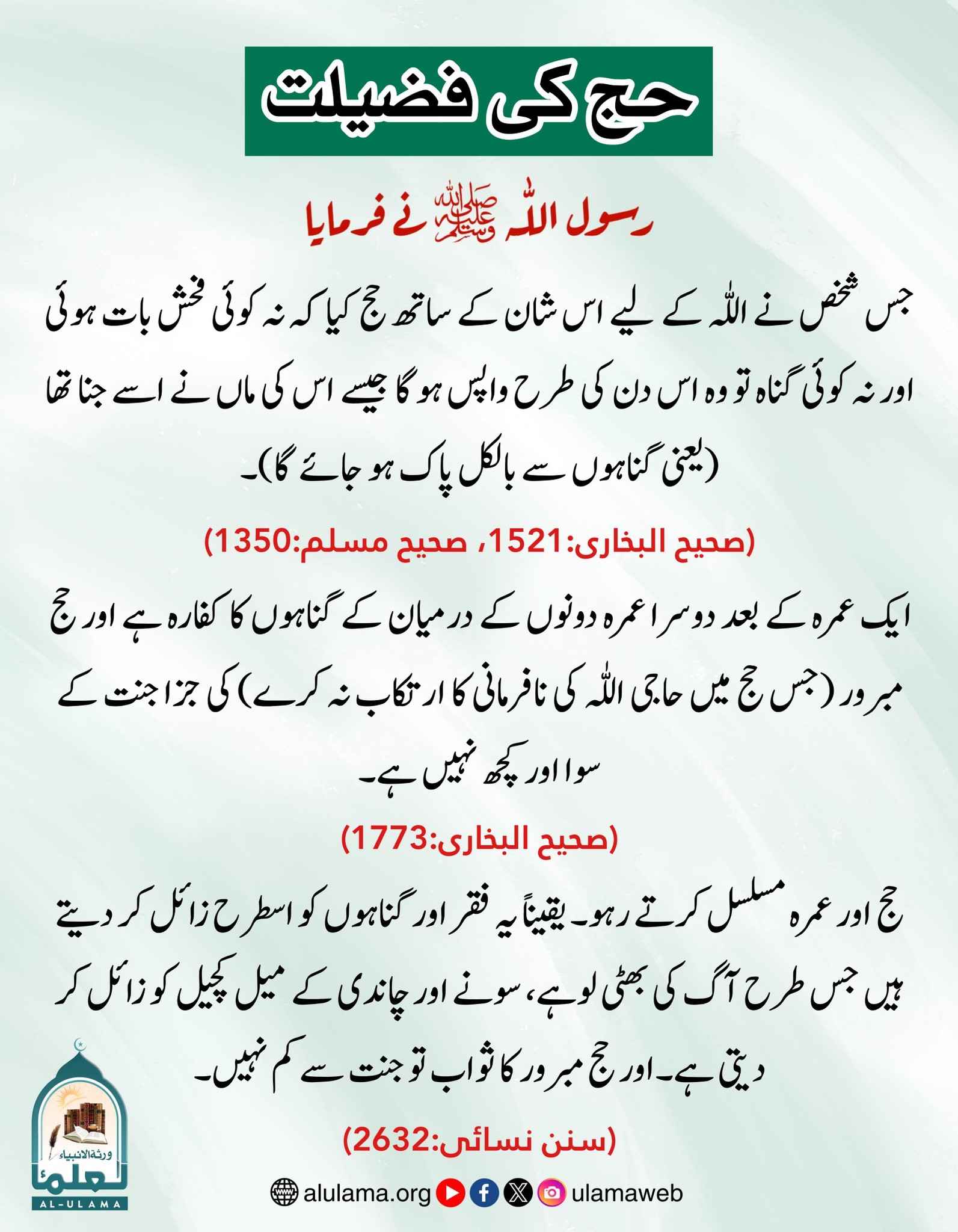 Post published: جولائی 16, 2025 Post category: عمرہ، حج وقربانی ناشر: العلماء حج کی فضیلت Post Views: 488 اس موضوع کے دیگر گرافکس مزید دیکھیں 350 بار دیکھا گیا عمرہ، حج وقربانی حجر اسود اور رکن یمانی کو چھونا گناہوں کو مٹا دیتا ہے ستمبر 13, 2024 290 بار دیکھا گیا عمرہ، حج وقربانی حج کے دنوں میں عمرہ کرنا جولائی 18, 2025 207 بار دیکھا گیا عمرہ، حج وقربانی حاجی صاحبان اور عرفہ کا روزہ جولائی 9, 2025 اس ناشر کے دیگر گرافکس مزید دیکھیں 148 بار دیکھا گیا 01. محرم الحرام حضرت عمر کے اسلام لانے سے اسلام کو عزت ملی جنوری 4, 2025 283 بار دیکھا گیا اعمال، وظائف، اذکار وادعیہ سورۃ البقرہ کی آخری دو آیات اکتوبر 8, 2024 178 بار دیکھا گیا اسمائے حسنیٰ امن دینے والا اکتوبر 10, 2024