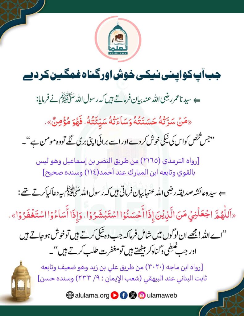 Post published: مارچ 31, 2026 Post category: آداب واخلاق - اعمال، وظائف، اذکار وادعیہ - ایمانیات - تعلیم وتربیت ناشر: العلماء جب آپ کو اپنی نیکی خوش اور گناہ غمگین کر دے Post Views: 18 اس موضوع کے دیگر گرافکس مزید دیکھیں 348 بار دیکھا گیا آداب واخلاق بیوی کے ساتھ نرمی اور حسن سلوک ستمبر 30, 2025 114 بار دیکھا گیا آداب واخلاق ادب ہی سارا دین ہے ستمبر 18, 2024 173 بار دیکھا گیا 06. جمادی الآخر جو شخص آپ پر ایک مرتبہ درود بھیجتا ہے جون 12, 2024 اس ناشر کے دیگر گرافکس مزید دیکھیں 146 بار دیکھا گیا اصلاح معاشرہ سود کا انجام جنوری 20, 2025 303 بار دیکھا گیا اصلاح معاشرہ سنی سنائی بات بغیر تحقیق بیان کرنا اکتوبر 22, 2024 171 بار دیکھا گیا اعمال، وظائف، اذکار وادعیہ تو جنت اس کے لیے واجب ہو گئی نومبر 1, 2024