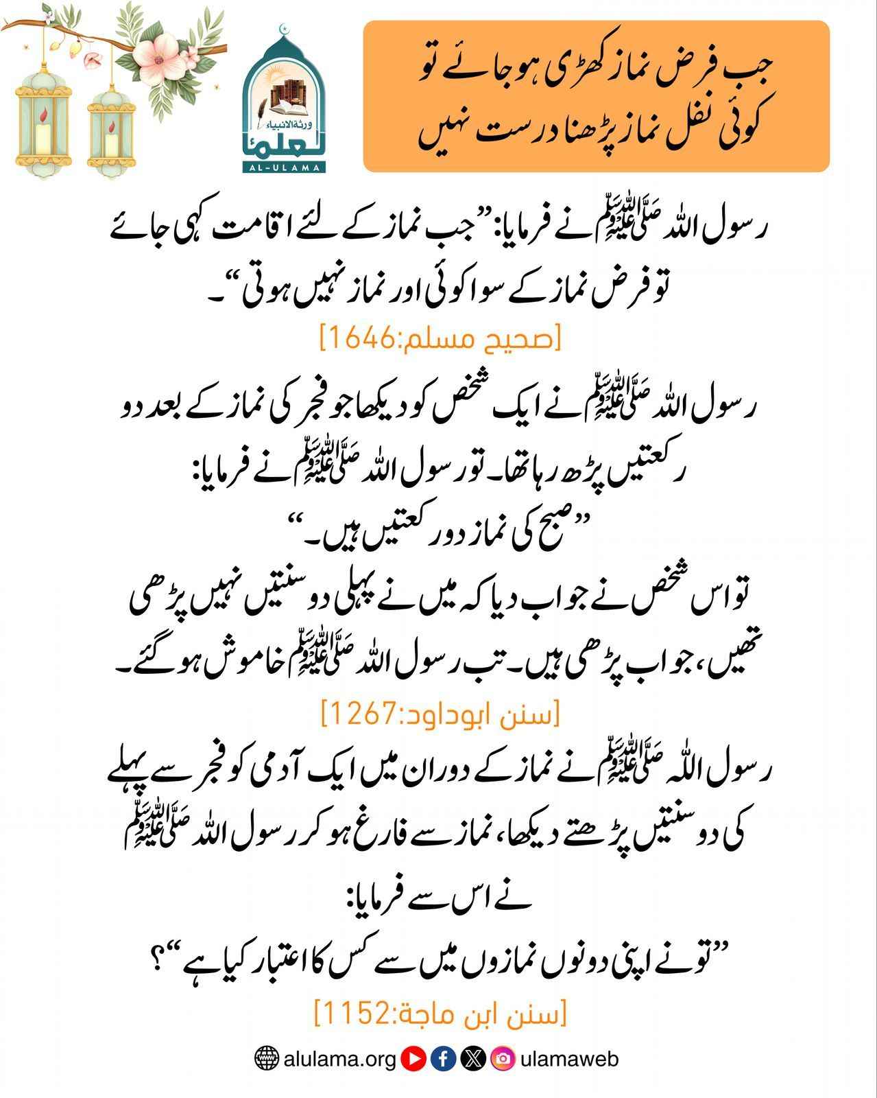 Post published: اگست 8, 2025 Post category: احکام ومسائل نماز ناشر: العلماء جب فرض نماز کھڑی ہو جائے تو کوئی نفل نماز پڑھنا درست نہیں Post Views: 463 اس موضوع کے دیگر گرافکس مزید دیکھیں 196 بار دیکھا گیا احکام ومسائل نماز اللہ تعالی کے نزدیک محبوب ترین عمل جنوری 30, 2024 196 بار دیکھا گیا احکام ومسائل نماز بلا عذر بیٹھ کر نماز پڑھنا دسمبر 27, 2023 98 بار دیکھا گیا احکام ومسائل نماز مسجد میں دوسرے سے نمازیوں کا خیال رکھنا ضروری ہے دسمبر 27, 2023 اس ناشر کے دیگر گرافکس مزید دیکھیں 100 بار دیکھا گیا 23. عربی گرافکس كأنه قطعة قمر دسمبر 24, 2024 173 بار دیکھا گیا تاریخ وتدوین حدیث سلسلہ حجیت حدیث اگست 13, 2024 252 بار دیکھا گیا آداب واخلاق والدین کے ساتھ حسن سلوک اکتوبر 31, 2024