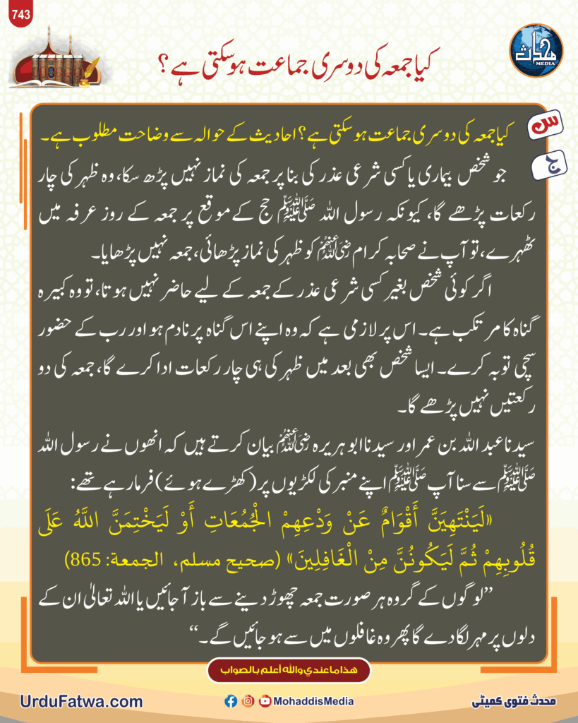 Post published: مئی 29, 2025 Post category: فقہ وفتاویٰ - نماز جمعہ احکام ومسائل ناشر: مرکز النور (محدث میڈیا) کیا جمعہ کی دوسری جماعت ہو سکتی ہے Post Views: 107 اس موضوع کے دیگر گرافکس مزید دیکھیں 104 بار دیکھا گیا احکام ومسائل نماز جماعت میں شامل ہونے کے لیے آرام اور سکون سے چلیں نومبر 4, 2025 83 بار دیکھا گیا احکام ومسائل نماز نادانستہ ناپاک کپڑوں میں نماز پڑھ لینا فروری 28, 2025 187 بار دیکھا گیا عمرہ، حج وقربانی کیا عمرہ میں مدینہ منورہ جانا لازمی ہے؟ اکتوبر 30, 2025 اس ناشر کے دیگر گرافکس مزید دیکھیں 51 بار دیکھا گیا آداب واخلاق جانداروں کے ساتھ حسن سلوک دسمبر 20, 2023 89 بار دیکھا گیا اصلاح معاشرہ اللہ تبارک وتعالی اور ہمارا گمان دسمبر 25, 2023 140 بار دیکھا گیا آداب واخلاق رکیے جھوٹ سے خود کو ہلاک مت کیجئے دسمبر 21, 2023