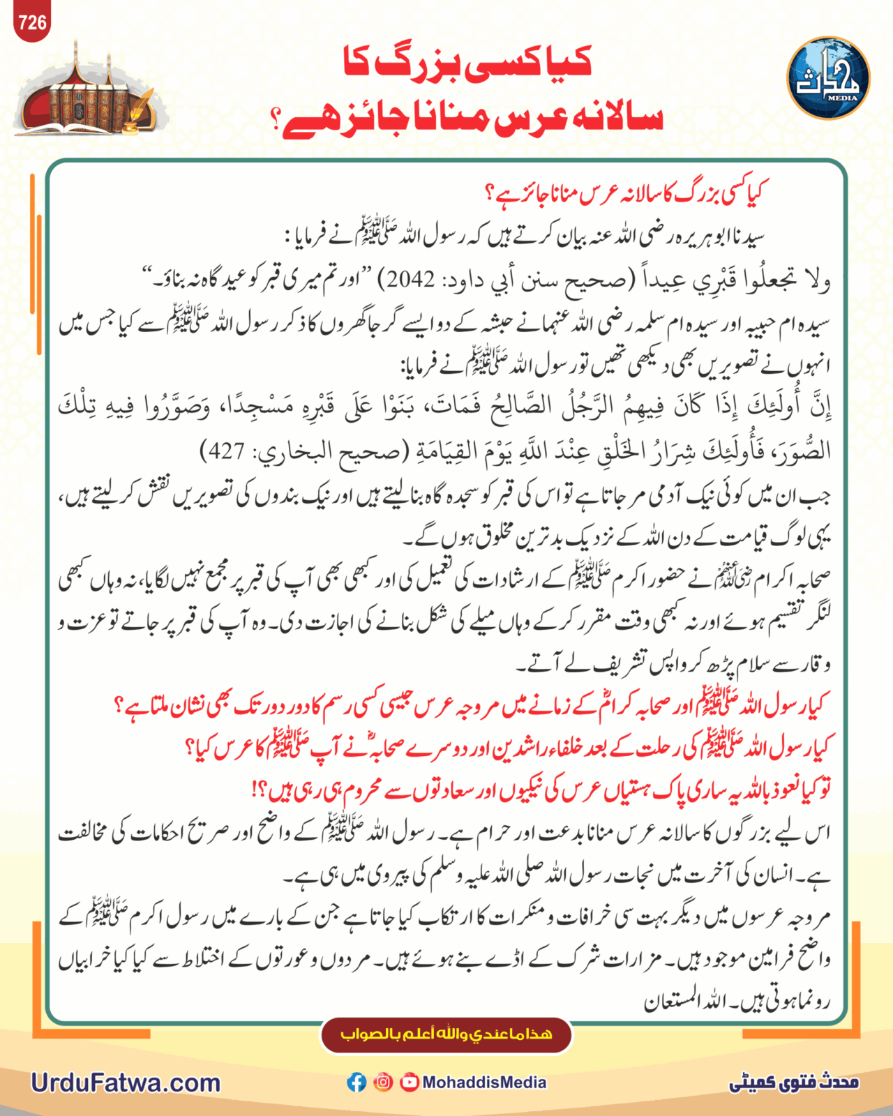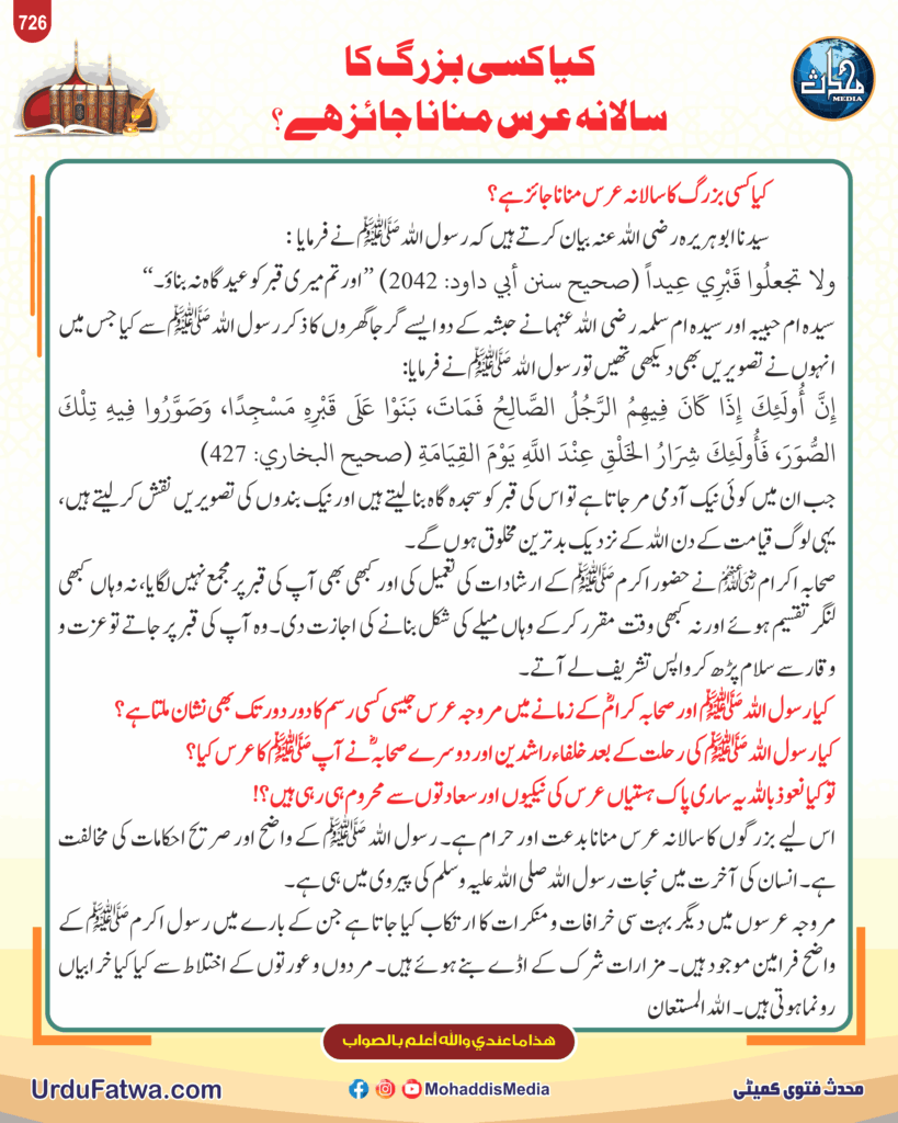 Post published: مئی 28, 2025 Post category: فقہ وفتاویٰ - مزار، دربار، عرس وقوالی ناشر: مرکز النور (محدث میڈیا) کیا کسی بزرگ کا سالانہ عرس منانا جائز ہے Post Views: 216 اس موضوع کے دیگر گرافکس مزید دیکھیں 352 بار دیکھا گیا ٹیکس وسود سود لینے والا اور دینے والا دونوں مجرم ہیں نومبر 11, 2025 165 بار دیکھا گیا سنتیں نوافل نماز وتر تہجد و تراویح تراویح کا اہتمام خوش نصیب ہی کرتا ہے جولائی 2, 2025 176 بار دیکھا گیا زکوۃ، صدقات وعشر بیٹیوں کے زیورات پر زکوٰۃ فروری 18, 2025 اس ناشر کے دیگر گرافکس مزید دیکھیں 159 بار دیکھا گیا احکام ومسائل نماز جب مقتدی رکوع کی حالت میں ملے اپریل 29, 2025 62 بار دیکھا گیا انگلش گرافکس Allah’s Kingdom دسمبر 18, 2025 127 بار دیکھا گیا اعمال، وظائف، اذکار وادعیہ ناگواری کے باوجود وضو کرنے کی فضیلت فروری 20, 2026