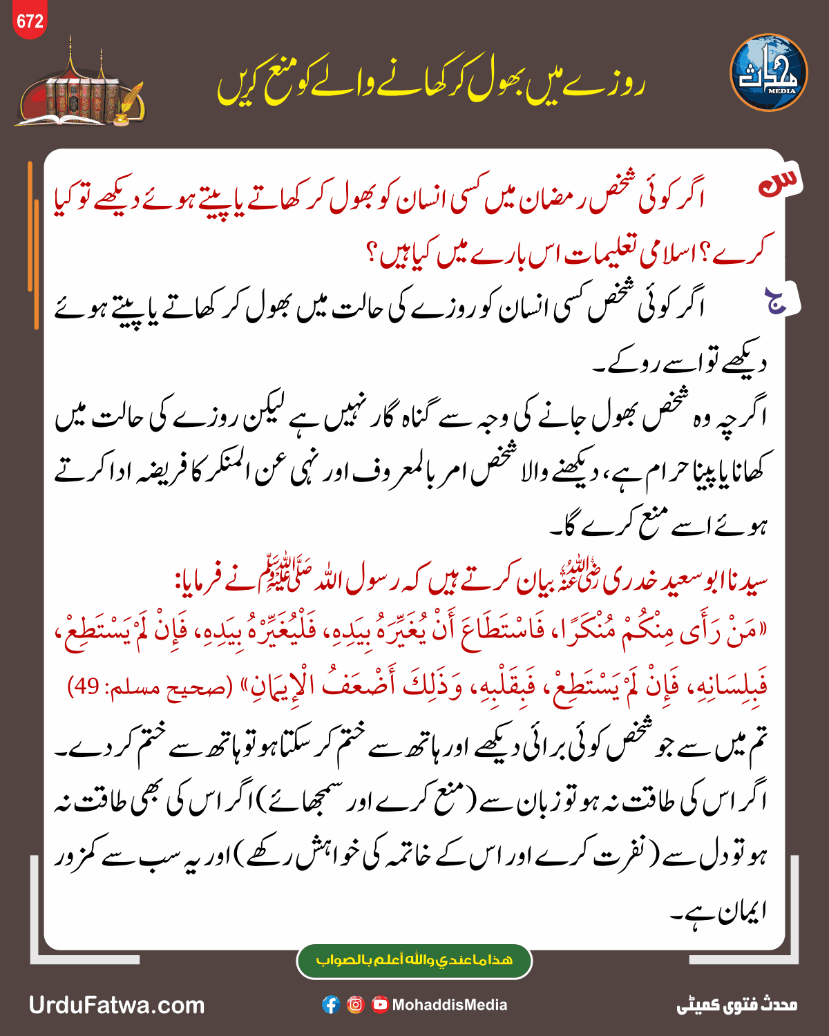Post published: مئی 16, 2025 Post category: 09. رمضان المبارک - فضائل ومسائل رمضان وروزہ - فقہ وفتاویٰ ناشر: مرکز النور (محدث میڈیا) روزے میں بھول کر کھانے والے کو منع کریں Post Views: 66 اس موضوع کے دیگر گرافکس مزید دیکھیں 65 بار دیکھا گیا فضائل ومسائل رمضان وروزہ لیلۃ القدر کی شب کو فرشتے ہر حکم لے کر اترتے ہیں جنوری 19, 2024 167 بار دیکھا گیا فقہ وفتاویٰ اسلام کے ارکان مئی 15, 2025 93 بار دیکھا گیا 09. رمضان المبارک رمضان کریم کے روزوں کی فرضیت جنوری 3, 2024 اس ناشر کے دیگر گرافکس مزید دیکھیں 131 بار دیکھا گیا سنتیں نوافل نماز وتر تہجد و تراویح آیت سجدہ سننے سے سجدہ کرنا اپریل 24, 2025 198 بار دیکھا گیا بدعات ورسومات بدعت اور بدعتیوں کی مذمت احادیث مبارکہ سے مئی 3, 2025 110 بار دیکھا گیا طہارت وپاکیزگی مقعد سے بال صاف کرنے کا حکم مئی 29, 2025