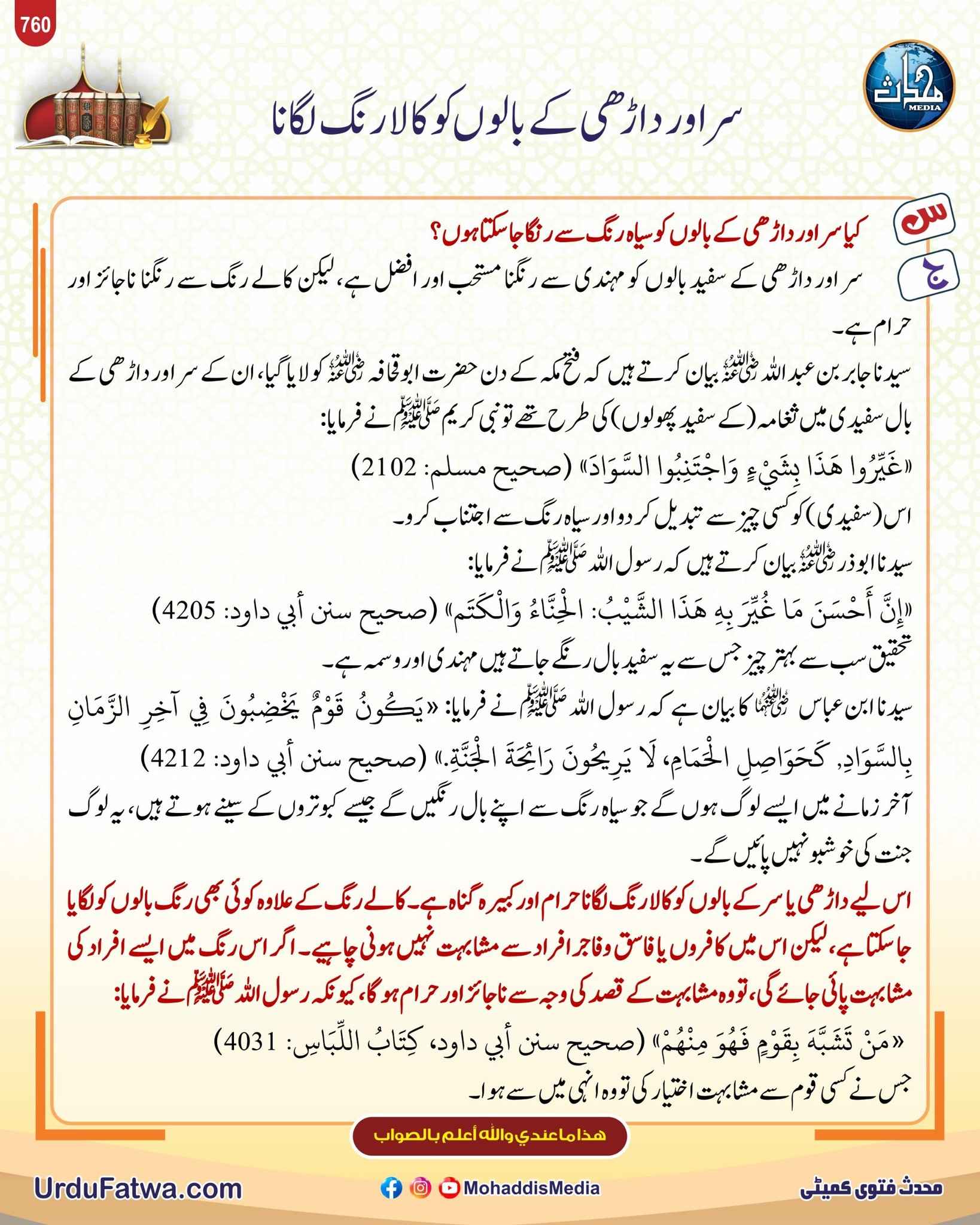 Post published: نومبر 5, 2025 Post category: آداب واخلاق - داڑھی وخضاب - فقہ وفتاویٰ ناشر: مرکز النور (محدث میڈیا) سر اور داڑھی کے بالوں کو کالا رنگ لگانا Post Views: 336 اس موضوع کے دیگر گرافکس مزید دیکھیں 380 بار دیکھا گیا فقہ وفتاویٰ شوہر کیسا ہونا چاہیے مئی 3, 2025 96 بار دیکھا گیا طہارت وپاکیزگی موزوں اور جرابوں پر مسح کرنے کی مدت کی ابتدا اور انتہا فروری 19, 2026 201 بار دیکھا گیا آداب واخلاق دو مسلمان جن کی بخشش نہیں ہوتی دسمبر 12, 2023 اس ناشر کے دیگر گرافکس مزید دیکھیں 205 بار دیکھا گیا فقہ وفتاویٰ بچوں میں مساوات مارچ 19, 2025 85 بار دیکھا گیا 18. متفرق احکام ومسائل بارش کے باوجود اناج کی قلت جنوری 13, 2024 254 بار دیکھا گیا سیرت اولیاء اللہ اصحاب کہف کا کتا اپریل 22, 2025