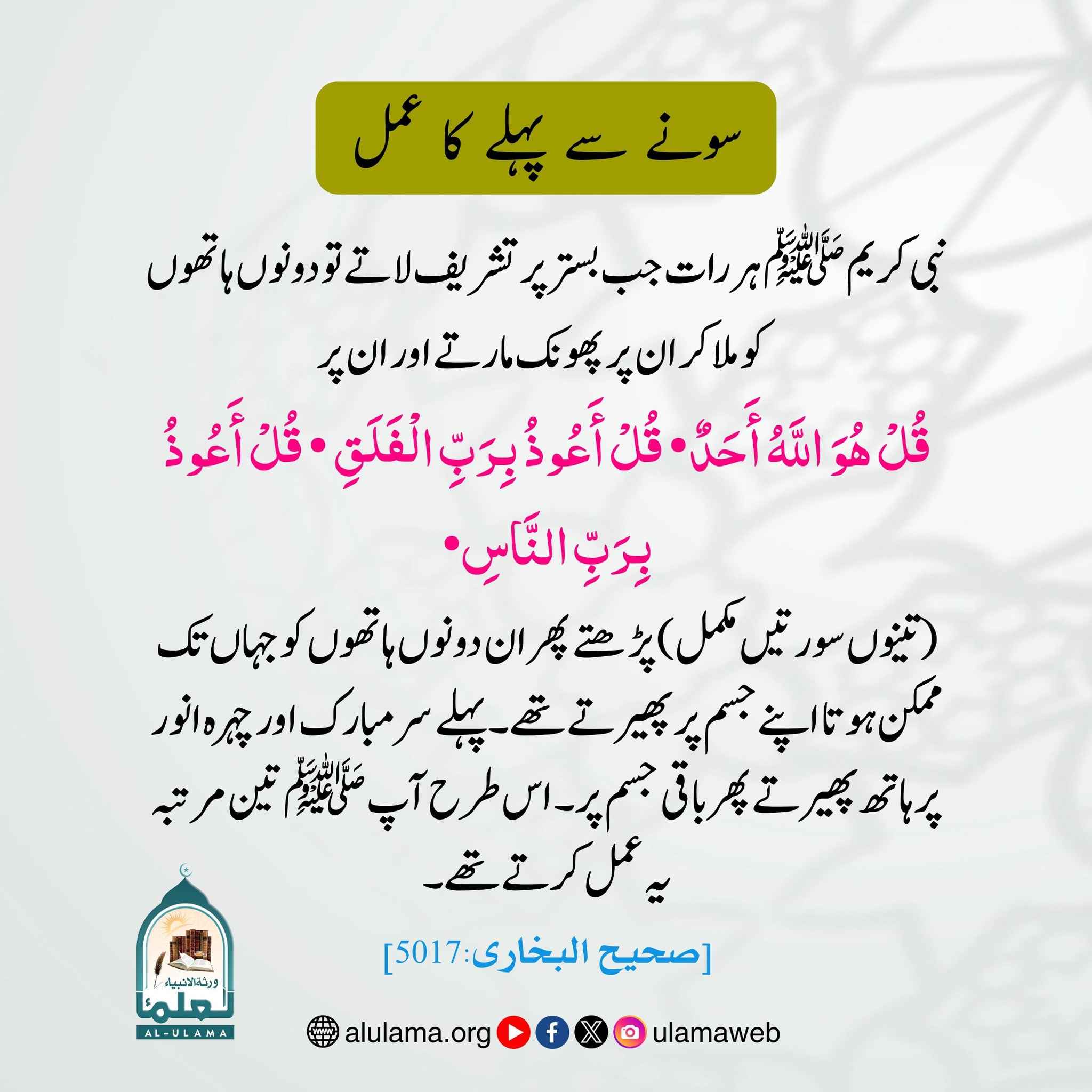 Post published: مارچ 30, 2026 Post category: آداب واخلاق - شب و روز کی پیاری سنتیں ناشر: العلماء سونے سے پہلے کا عمل Post Views: 29 اس موضوع کے دیگر گرافکس مزید دیکھیں 254 بار دیکھا گیا آداب واخلاق شام کو شیطان گھر میں داخل نہ ہو سکے اگست 28, 2025 256 بار دیکھا گیا آداب واخلاق نصیحت کا سلیقہ سننے کا ظرف اکتوبر 29, 2025 224 بار دیکھا گیا آداب واخلاق اخلاق حسنہ کیا ہیں؟ دسمبر 19, 2023 اس ناشر کے دیگر گرافکس مزید دیکھیں 165 بار دیکھا گیا 23. عربی گرافکس أحب إلي مما طلعت عليه الشمس جولائی 10, 2024 197 بار دیکھا گیا کھانے پینے اور روز مرہ کے آداب ٹیک لگا کر کھانا اکتوبر 8, 2024 130 بار دیکھا گیا آداب واخلاق جو دو شخص اللہ کے لیے آپس میں محبت کرتے ہیں ستمبر 26, 2024