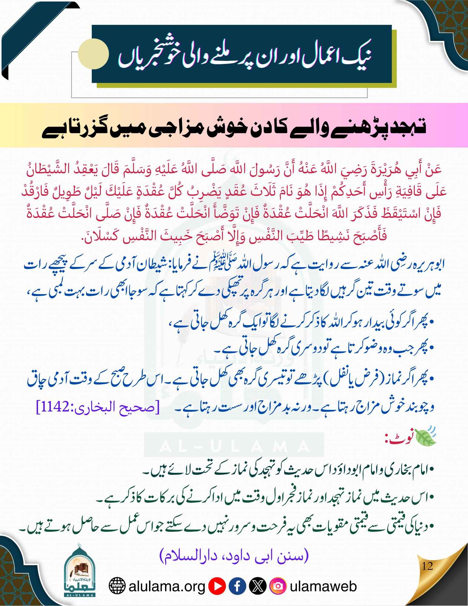 Post published: جولائی 17, 2025 Post category: اعمال، وظائف، اذکار وادعیہ - سنتیں نوافل نماز وتر تہجد و تراویح ناشر: العلماء تہجد پڑھنے والے کا دن خوش مزاجی میں گزرتا ہے Post Views: 212 اس موضوع کے دیگر گرافکس مزید دیکھیں 422 بار دیکھا گیا اعمال، وظائف، اذکار وادعیہ دن بھر شیطان سے محفوظ رہنے کی دعا دسمبر 28, 2023 475 بار دیکھا گیا احکام ومسائل نماز آخری تشہد میں رب اجعلنی مقیم الصلوۃ پڑھنا جنوری 19, 2024 119 بار دیکھا گیا احکام ومسائل قرآن گناہ گاروں کیلئے امید کی کرن دسمبر 29, 2023 اس ناشر کے دیگر گرافکس مزید دیکھیں 227 بار دیکھا گیا اصلاح معاشرہ ظالم اور اس کی مدد اور اس کو پسند کرنے والا سب برابر ہیں اکتوبر 9, 2024 44 بار دیکھا گیا سیرت صحابہ وصحابیات خوشی کی انتہا جولائی 17, 2024 142 بار دیکھا گیا اصلاح معاشرہ اللہ کے رنگ جنوری 14, 2025
