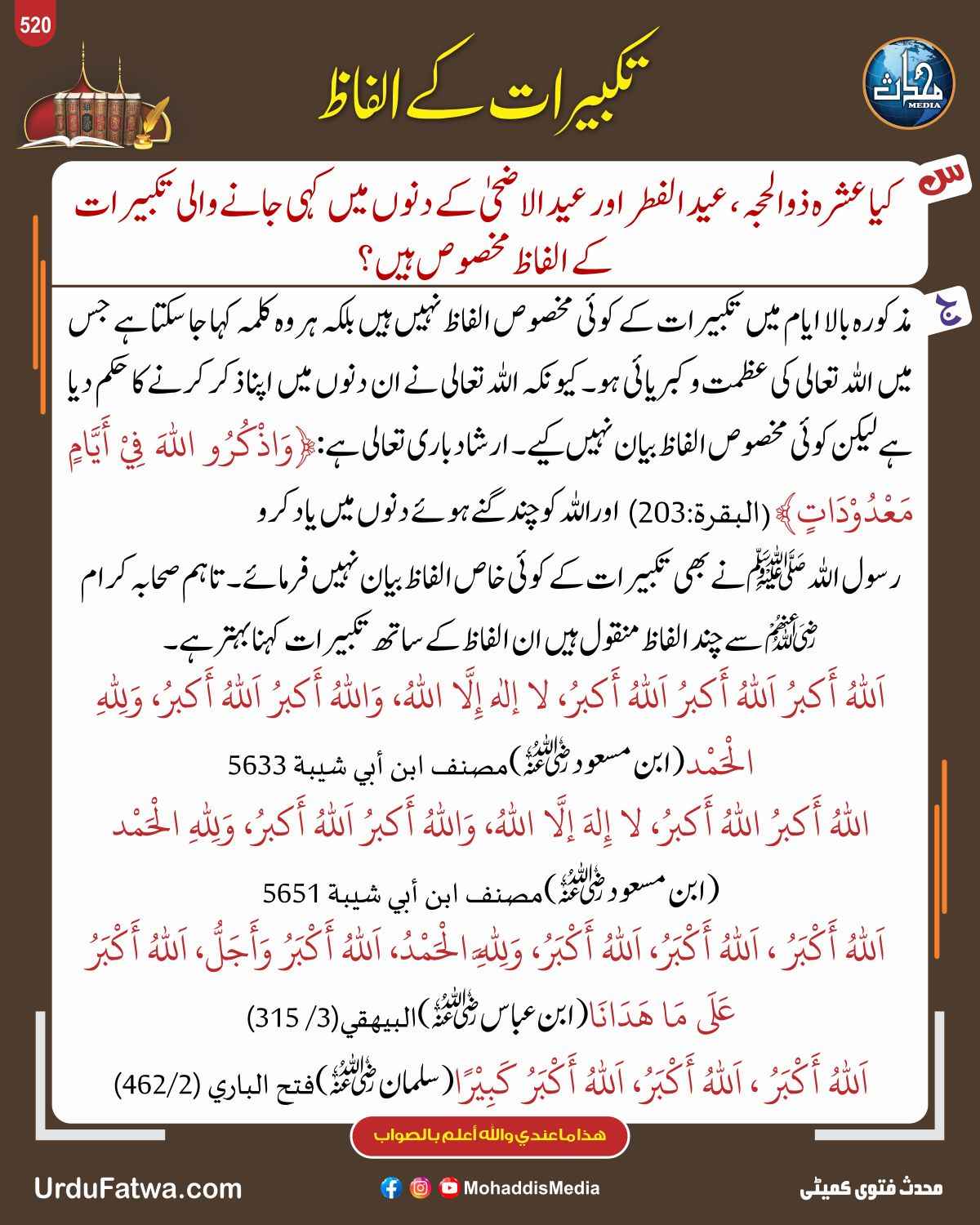 Post published: جولائی 5, 2025 Post category: اعمال، وظائف، اذکار وادعیہ - فقہ وفتاویٰ ناشر: مرکز النور (محدث میڈیا) تکبرات کے الفاظ Post Views: 167 اس موضوع کے دیگر گرافکس مزید دیکھیں 236 بار دیکھا گیا احکام ومسائل نماز وقت سے پہلے نماز پڑھنا جنوری 23, 2024 175 بار دیکھا گیا اعمال، وظائف، اذکار وادعیہ سب سے بلند جنت جنت الفردوس ہے دسمبر 12, 2023 394 بار دیکھا گیا فقہ وفتاویٰ تہجد اور اس کی رکعات اپریل 18, 2025 اس ناشر کے دیگر گرافکس مزید دیکھیں 105 بار دیکھا گیا اعمال، وظائف، اذکار وادعیہ تکلیف دور کرنے کا علاج فروری 1, 2024 160 بار دیکھا گیا ارشاد باری تعالٰی حلال وہ جو صرف اللہ کے نام پر ہو نومبر 13, 2025 134 بار دیکھا گیا 01. محرم الحرام اہل بیت کا احترام ستمبر 30, 2025