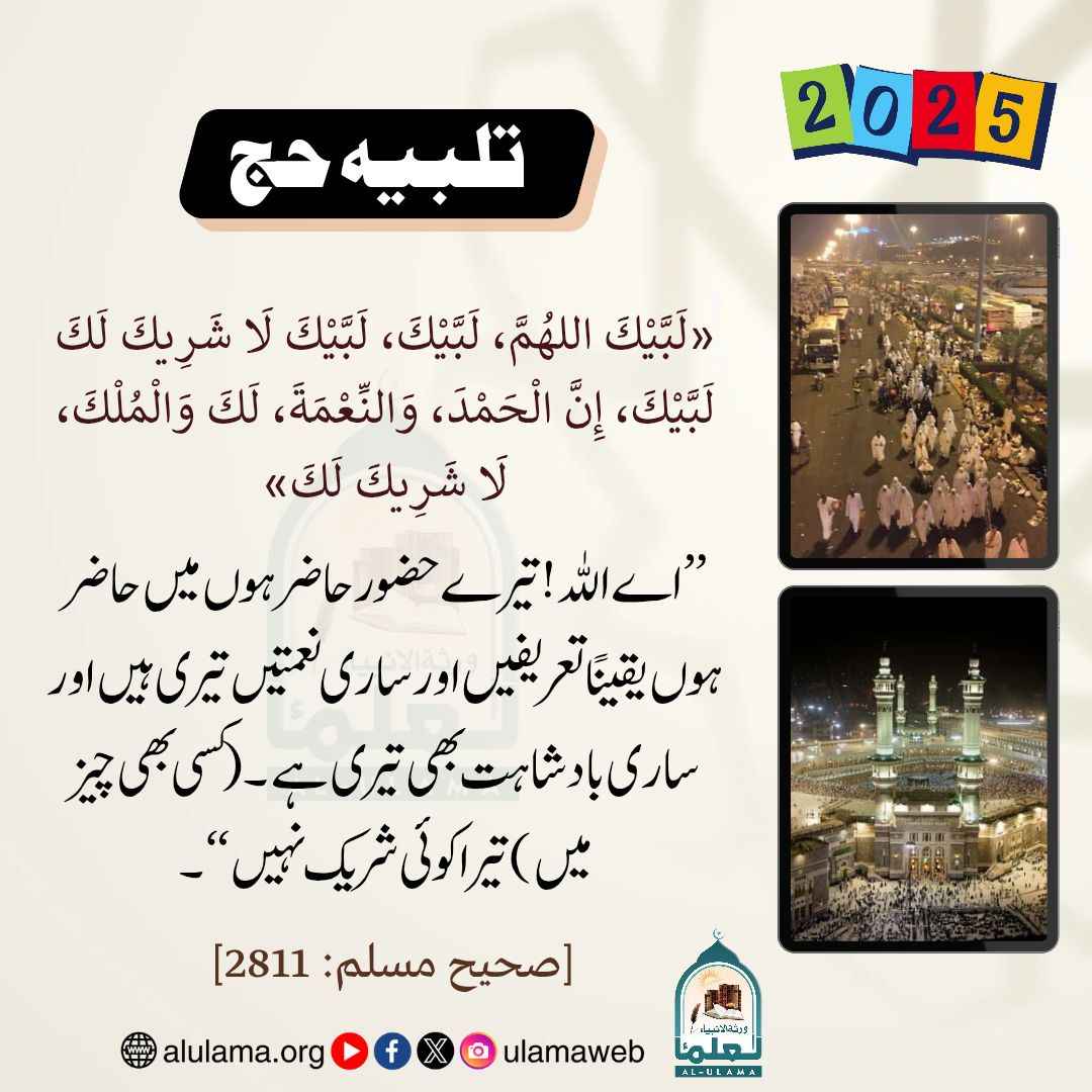 Post published: جولائی 16, 2025 Post category: عمرہ، حج وقربانی ناشر: العلماء تلبیہ حج Post Views: 148 اس موضوع کے دیگر گرافکس مزید دیکھیں 102 بار دیکھا گیا 12. ذی الحجہ قربانی کا گوشت محفوظ کرنا جون 10, 2024 80 بار دیکھا گیا خواتین کے احکام ومسائل محرم کے بغیر حج اکتوبر 10, 2024 103 بار دیکھا گیا 12. ذی الحجہ یوم عرفہ کی فضیلت جون 8, 2024 اس ناشر کے دیگر گرافکس مزید دیکھیں 136 بار دیکھا گیا اصلاح معاشرہ قیامت کے دن بدترین وہ آدمی ہوگا ستمبر 11, 2024 85 بار دیکھا گیا اسمائے حسنیٰ بادشاہ اکتوبر 10, 2024 96 بار دیکھا گیا اعمال، وظائف، اذکار وادعیہ یہ ایک کلمہ ترازو کو بھر دیتا ہے اکتوبر 15, 2024