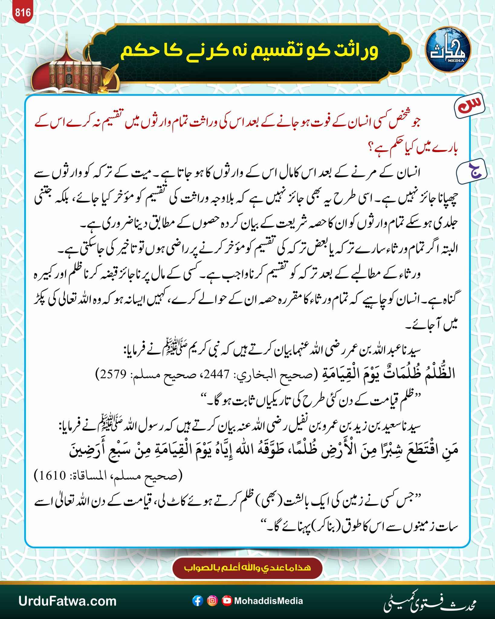 Post published: جولائی 12, 2025 Post category: فقہ وفتاویٰ - وراثت ووصیت ناشر: مرکز النور (محدث میڈیا) وراثت کو تقسیم نہ کرنے کا حکم Post Views: 188 اس موضوع کے دیگر گرافکس مزید دیکھیں 158 بار دیکھا گیا فقہ وفتاویٰ بچوں کو جنوں سے ڈرانا مئی 20, 2025 171 بار دیکھا گیا فقہ وفتاویٰ گرین کارڈ کے حصول کے لیے نکاح کرنا مارچ 1, 2025 273 بار دیکھا گیا فقہ وفتاویٰ نماز جنازہ کی قراءت مارچ 14, 2025 اس ناشر کے دیگر گرافکس مزید دیکھیں 239 بار دیکھا گیا آداب واخلاق مسلمان سے جھگڑا کفر تک پہنچا سکتا ہے دسمبر 27, 2023 287 بار دیکھا گیا خواتین کے احکام ومسائل غیر مدخولہ پر عدت وفات ضروری ہے اپریل 14, 2025 209 بار دیکھا گیا احکام ومسائل نماز مسابقہ شرکت تکبیر اولی اکتوبر 3, 2025